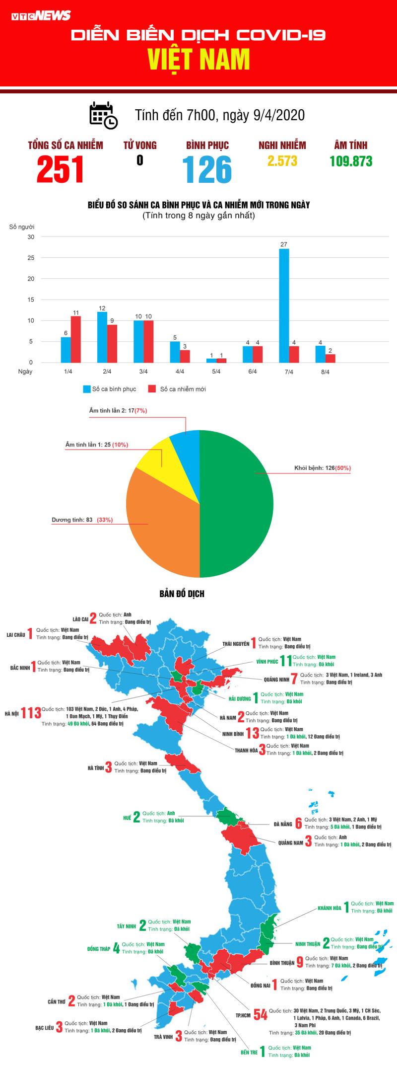 Infographic: Diễn biến dịch COVID-19 tại Việt Nam ngày 9/4 - Đến 7h ngày 9/4, theo Bộ Y tế, số người nhiễm COVID-19 tại Việt Nam là 251, trong đó 126 ca khỏi bệnh. Thứ Năm 09/04/2020 15:36 (GMT+7) Theo VTC