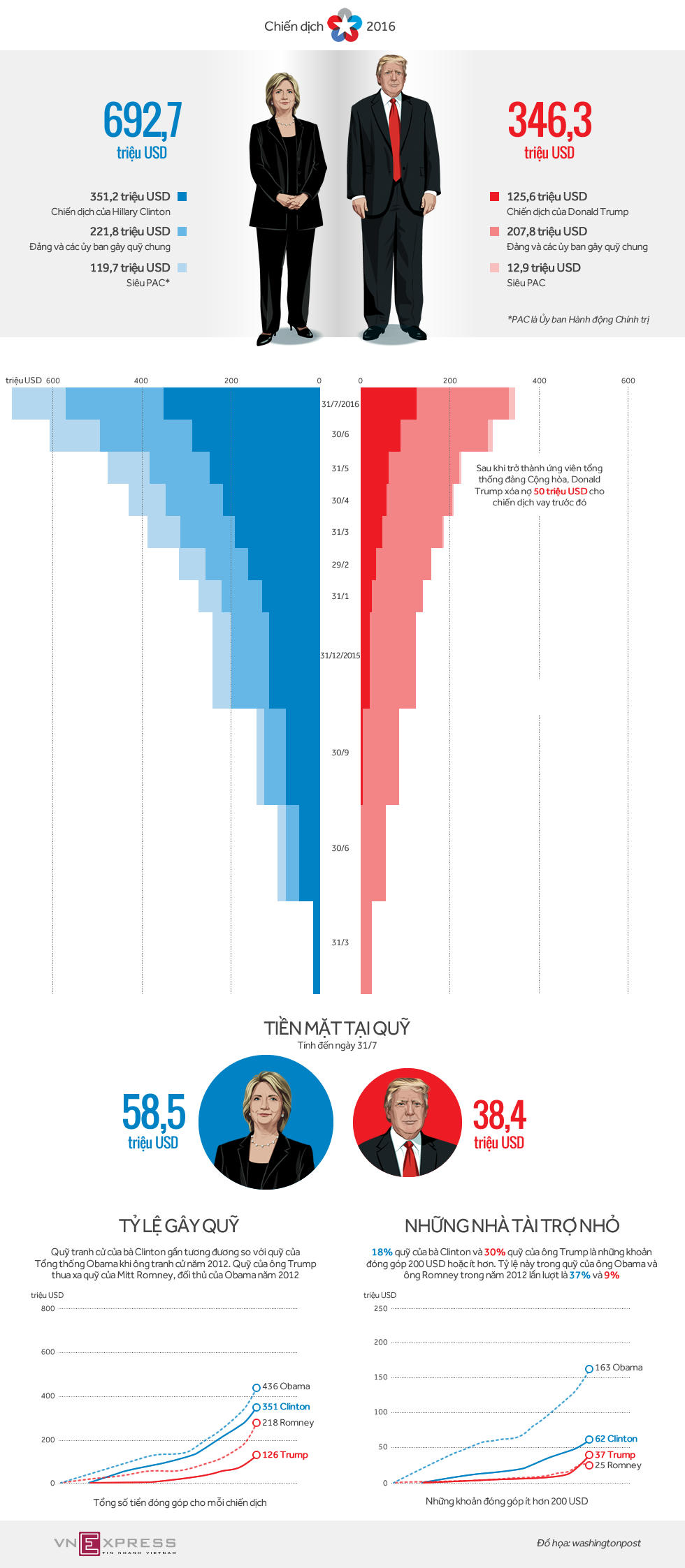 (PLO) - Tính đến cuối tháng 7, chiến dịch của ứng viên đảng Dân chủ Hillary Clinton huy động được gần 700 triệu USD, cao gấp đôi so với đối thủ đảng Cộng hòa Donald Trump.