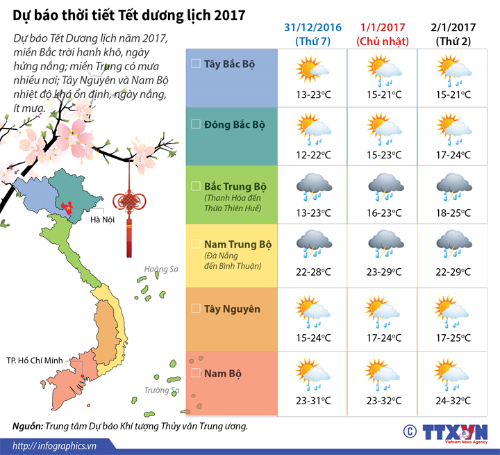 (PLO) - Dự báo Tết Dương lịch năm 2017, miền Bắc trời hanh khô, ngày hửng nắng; miền Trung có mưa nhiều nơi; Tây Nguyên và Nam Bộ nhiệt độ khá ổn định, ngày nắng, ít mưa
