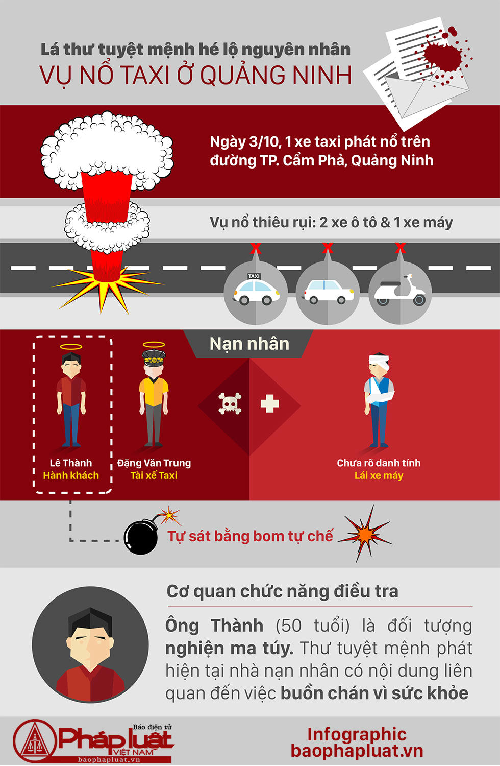 (PLO) - Sau tiếng nổ như bom, người ngồi trong xe taxi bị hất văng ra vệ đường nằm bất động. Chiếc ôtô cùng chiều vừa đi tới bị bén lửa rồi bốc cháy nghi ngút. Khi cơ quan chức năng đến kiểm tra nhà ở của nạn nhân - hành khách trong vụ nổ xe taxi vào chiều 3/10 ở Quảng Ninh thì phát hiện trong túi một chiếc quần của ông này có lá thư tuyệt mệnh.