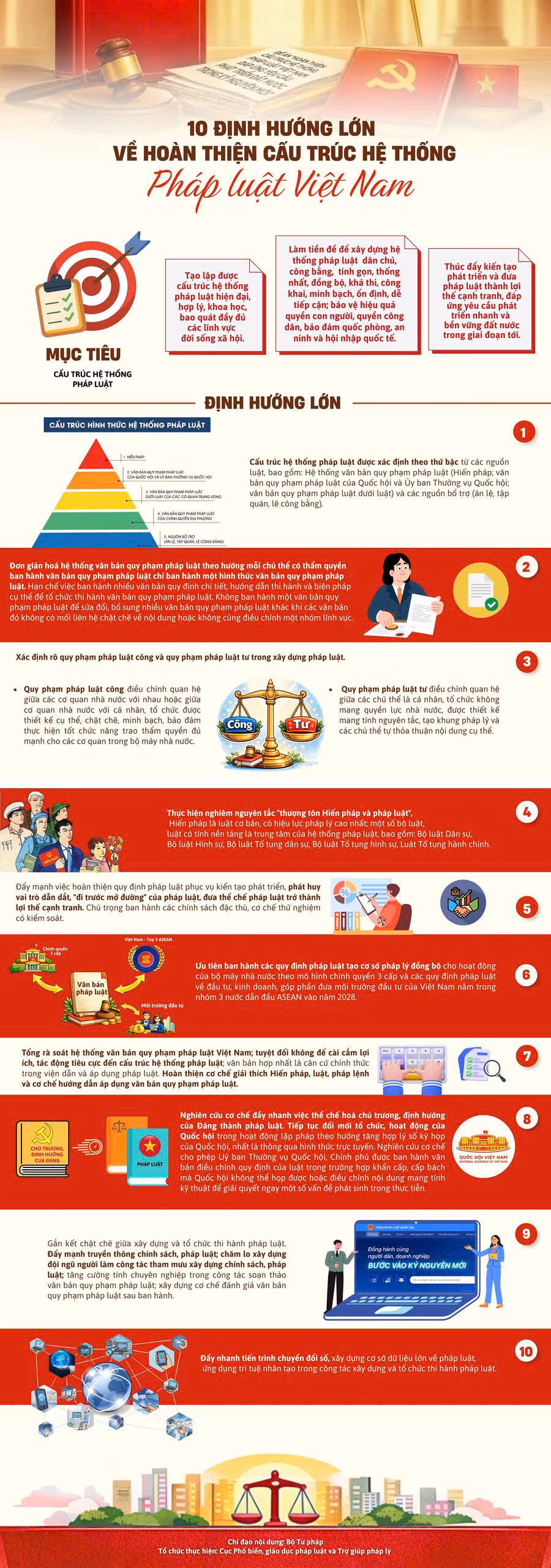 (PLVN) - Bộ Tư pháp đã xây dựng Infographic về Kết luận số 09 của Bộ Chính trị về hoàn thiện cấu trúc hệ thống pháp luật Việt Nam. Theo đó, có 10 định hướng lớn về hoàn thiện cấu trúc hệ thống pháp luật Việt Nam. Trân trọng giới thiệu cùng bạn đọc.
