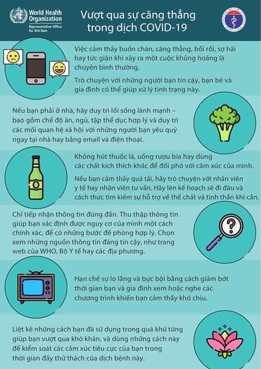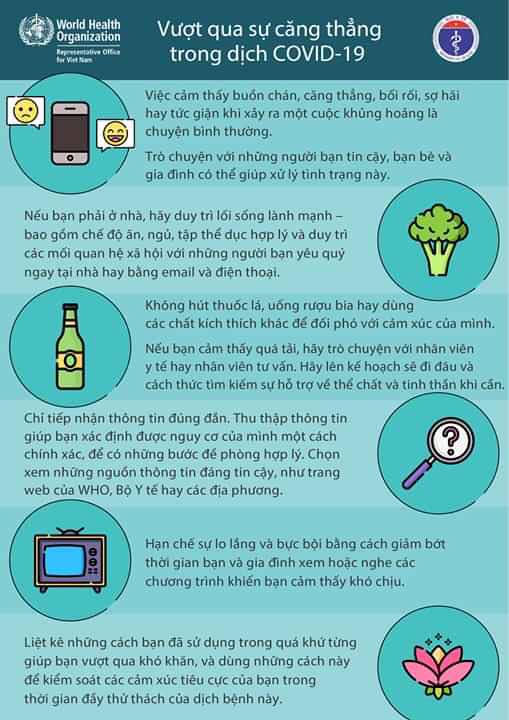 (PLVN) - Bộ Y tế và Văn phòng Tổ chức Y tế Thế giới tại Việt Nam vừa phối hợp xây dựng các infographics khuyến cáo cách giảm thiểu các căng thẳng, lo lắng trong mùa dịch COVID-19.