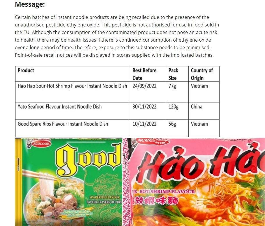 Theo thông báo của Cơ quan An toàn Thực phẩm Ireland (FSAI), FSAI quyết định thu hồi các lô sản phẩm mì ăn liền do có chứa Ethylene Oxide – thành phần thuốc trừ sâu. 3 dòng sản phẩm trong danh sách thu hồi bao gồm: mì Hảo Hảo vị tôm chua cay (loại 77 g, hạn sử dụng đến 24/9/2022), miến Good vị sườn heo (loại 56 g, hạn sử dụng đến 10/11/2022), mì Yato vị hải sản (loại 120g, hạn sử dụng đến 30/11/2022). Trong đó, 2 sản phẩm là mì Hảo Hảo và miến Good do công ty Acecook Việt Nam sản xuất, sản phẩm còn lại có xuất xứ từ Trung Quốc.