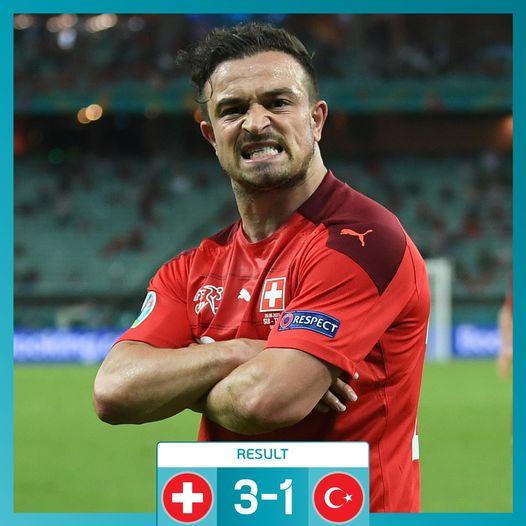 Nhờ cú đúp bàn thắng của tiền vệ Shaqiri cùng pha làm bàn của tiền đạo Seferovic, Thụy Sỹ đã giành chiến thắng ấn tượng 3-1 trước Thổ Nhĩ Kỳ ở lượt cuối vòng bảng EURO 2020. Dù kiếm trọn 3 điểm, Thụy Sỹ vẫn chỉ đứng thứ 3 ở bảng A sau Italia và Xứ Wales.