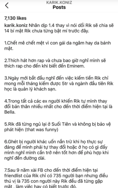 (PLVN) - Vào ngày nói dối, Karik chính thức công khai bản thân đang FA khi đăng tải một dòng trạng thái dài chia sẻ 14 điều chưa từng "bật mí".