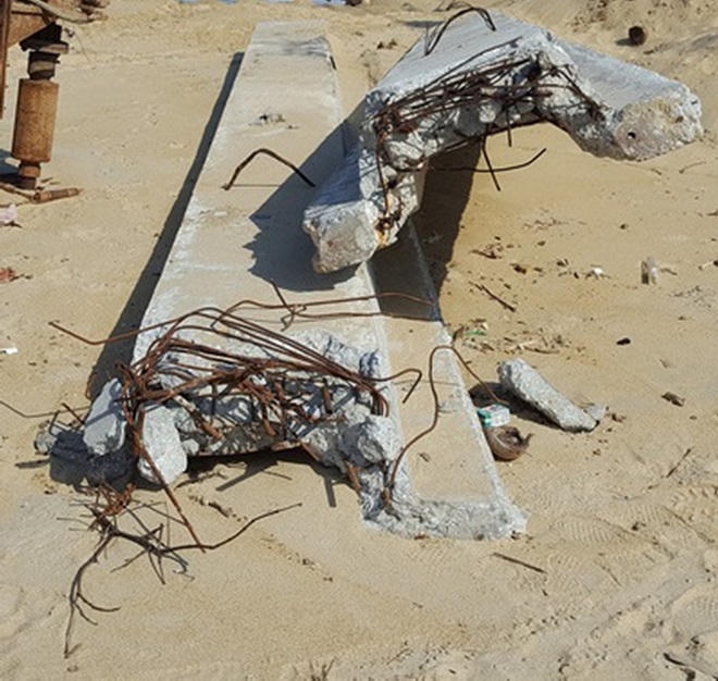 Ở một số vị trí khác, phần kè kiên cố đã bị cuốn phăng đi nơi khác. Sóng ăn sâu vào phần thân đê bằng đất, cát, gây sạt lở. Những đoạn kè còn trụ lại được xuất hiện nhiều vết nứt, dự báo nguy cơ tiếp tục bị đổ vỡ trước sóng biển.