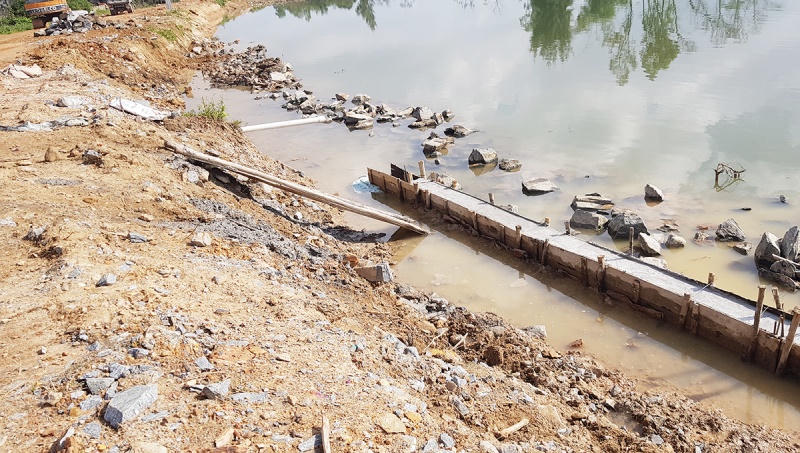Không chỉ đổ bê tông theo kiểu “ước chừng”, tại đây phần đất đắp kè cũng có nhiều loại; tạp chất, rác rưởi không được nhặt vẫn được đầm vào mái kè; kè chưa được đầm chặt đã rải vải địa. Trong khi đó, theo yêu cầu kỹ thuật thi công: Khi thi công hố móng phải đảm bảo khô ráo, có hệ thống thu gom nước và máy bơm tiêu nước hố móng. Tại đây đơn vị thi công không hút nước, không ngăn dòng khiến móng kè khi đổ bị ngập nước. Việc này bị đánh giá sẽ ảnh hưởng đến chất lượng bê tông dẫn đến chân kè không đảm bảo chất lượng, mà chân kè là một trong những hạng mục quan trọng trong kết cấu kè…