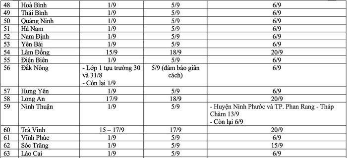 Kế hoạch khai giảng và học online của 63 tỉnh, thành phố vào ngày 5/9 (PLVN) - Theo lịch đi học lại, ngày mai, 5/9, có 57 tỉnh, thành cho học sinh khai giảng dưới hình thức online và trực tiếp. Thứ Bảy 04/09/2021 15:47 (GMT+7) Trang Ly (tổng hợp)