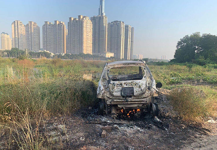 Khoảng 2 tiếng đồng hồ sau, cảnh sát phát hiện chiếc ôtô của nạn nhân bị đốt cháy ở bãi đất trống bên hông cầu Thủ Thiêm, quận 2. Tại hiện trường ôtô bị đốt, chiếc xe 4 chỗ chỉ còn trơ khung, nằm sát đường mòn.