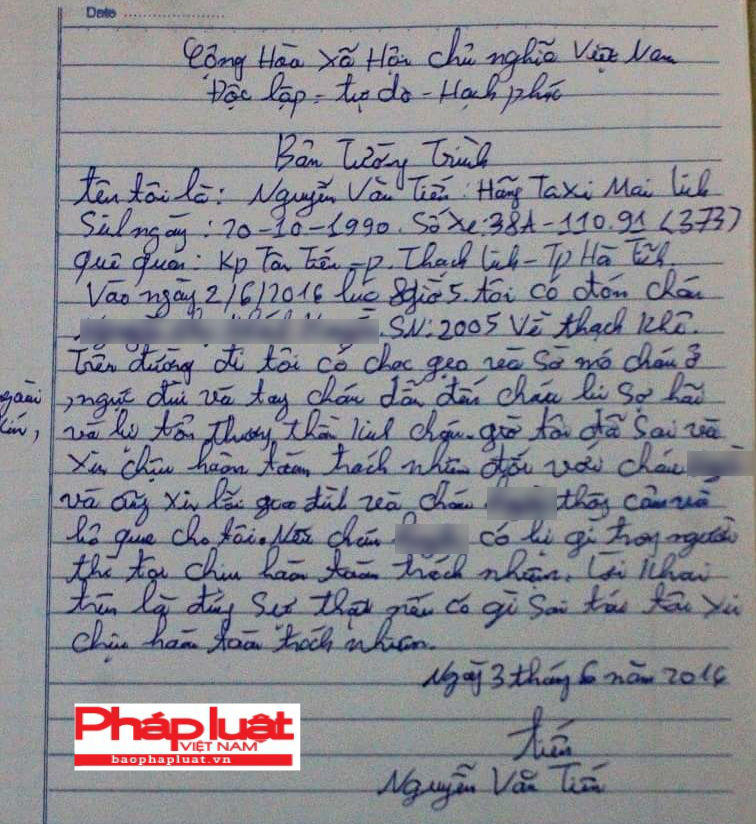 Nội dung bản tường trình được Tiến viết như sau: “Tôi tên là Nguyễn Văn Tiến ..., SN 20/10/1990, số xe 38A-110.9, trú tại KP Tân Tiến, P.Thạch Linh, Tp.Hà Tĩnh. Ngày 2/6/2016, lúc 8 giờ 5 phút, tôi có đón cháu P.G.T.H. (SN 2005) về Thạch Khê, trên đường đi tôi có chọc ghẹo và sờ mó cháu ở ngực, đùi và tay dẫn đến cháu bị sợ hãi và tổn thương thần kinh. Giờ đây tôi đã sai và xin chịu hoàn toàn trách nhiệm đối với cháu, và cũng xin cháu và gia đình bỏ qua và thông cảm bỏ qua cho tôi. Nếu cháu có bị gì trong người thi tôi xin chịu hoàn toàn trách nhiệm. Lời khai trên là đúng sự thật nếu có gì sai trái tôi xin chịu hoàn toàn trách nhiệm…”.