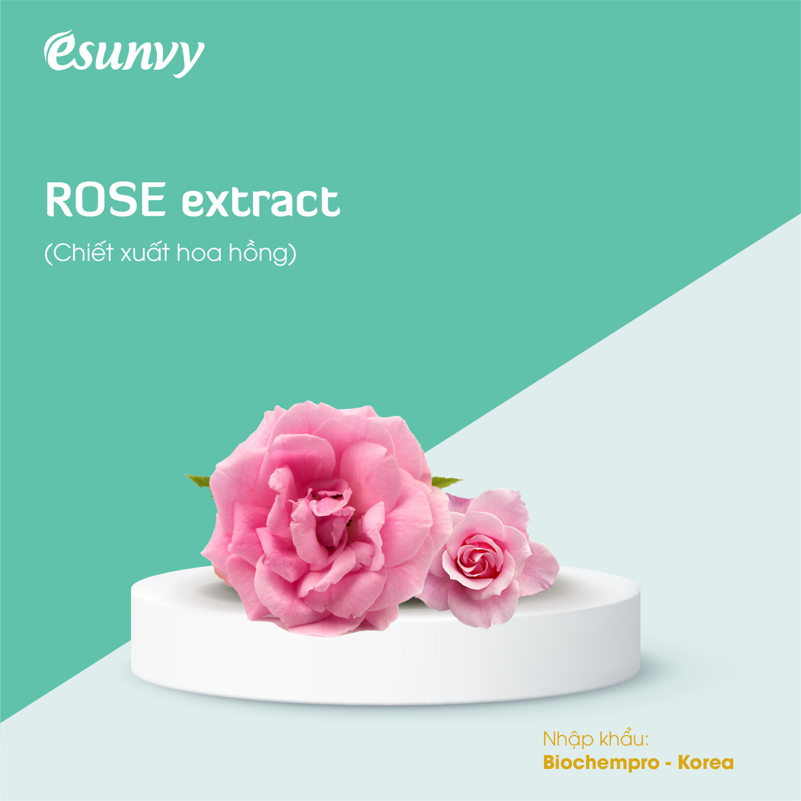 Rose Extract (Chiết xuất hoa hồng): -Ức chế hoạt động của tyrosinase (một enzym tổng hợp hắc sắc tố melanin), giúp dưỡng trắng da mịn từ bên trong, ngăn ngừa hình thành các vết nám. Chứa nhiều vitamin A, C, D, E giúp chống oxy hoá và chống lão hoá da, thúc đẩy sản sinh collagen giúp da căng mịn, hạn chế nếp nhăn, mụn. Dưỡng ẩm chuyên sâu. Giảm viêm lý tưởng cho mọi loại da. Làm sạch da và ngừa mụn.