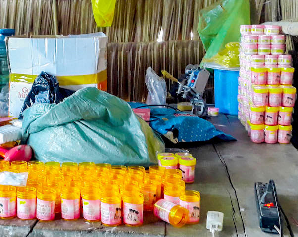 | Chai lọ, sản phẩm thành phẩm được phát hiện được cảnh sát tạm giữ. Ảnh:Công an cung cấp. |