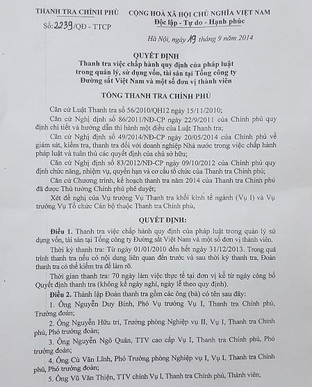 Ngày 19/09/2014, Tổng Thanh tra Chính phủ đã ra quyết định số 2239/QĐ – TTCP Thanh tra về việc Chấp hành quy định của pháp luật trong quản lý, sử dụng vốn, tài sản tại Tổng Công ty Đường sắt Việt Nam và một số đơn vị thành viên.