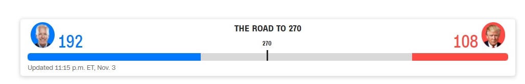 Theo thống kê được CNN đưa ra lúc 11.18 phút, ông Biden giành được 192 phiếu đại cử tri, ông Trump là 114