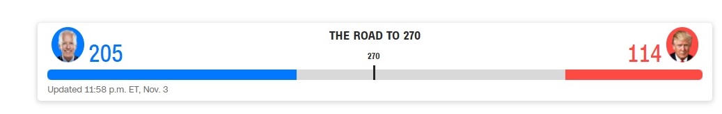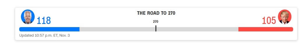 Tính đến 17h30 hôm nay 4/11 (giờ Việt Nam), tức chỉ vài giờ sau khi các điểm bỏ phiếu tại Mỹ đóng cửa, ứng cử viên Tổng thống đảng Dân chủ Joe Biden đang dẫn trước với 238 phiếu đại cử tri so với 213 phiếu của đối thủ đảng Cộng hòa, đương kim Tổng thống Donald Trump. Tuy nhiên, cuộc đua tại những bang chiến trường vẫn tiềm ẩn yếu tố bất ngờ.