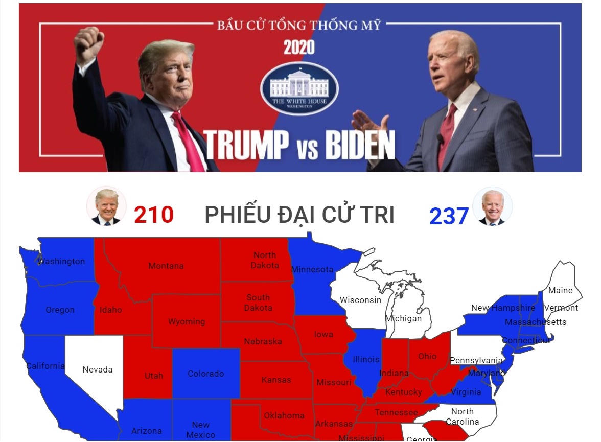 Lúc 01.00 ngày 4/11 (giờ Mỹ), TTXVN dẫn nguồn số liệu của US Network cho biết, ông Biden giành được 237 phiếu đại cử tri, trong khi ông Trump là 210.