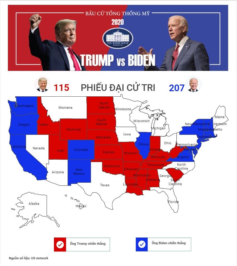 Lúc 11.30, TTXVN dẫn nguồn số liệu của US Network cho biết, ông Biden giành được 207 phiếu đại cử tri, trong khi ông Trump là 115.
