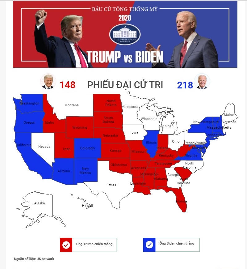 Lúc 11.30, TTXVN dẫn nguồn số liệu của US Network cho biết, ông Biden giành được 218 phiếu đại cử tri, trong khi ông Trump là 148.