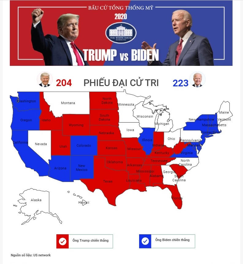 Lúc 12.10 TTXVN dẫn nguồn số liệu của US Network cho biết, ông Biden giành được 223 phiếu đại cử tri, trong khi ông Trump là 204.