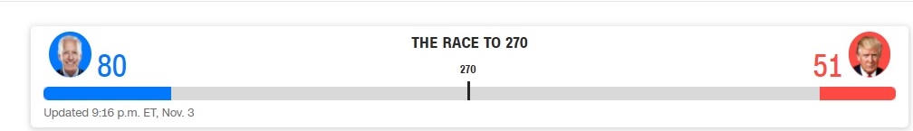 Tuy nhiên, thống kê của CNN tới 9.16 giờ địa phương, ông Biden giành được 80 phiếu đại cử tri, trong khi ông Trump là 51.