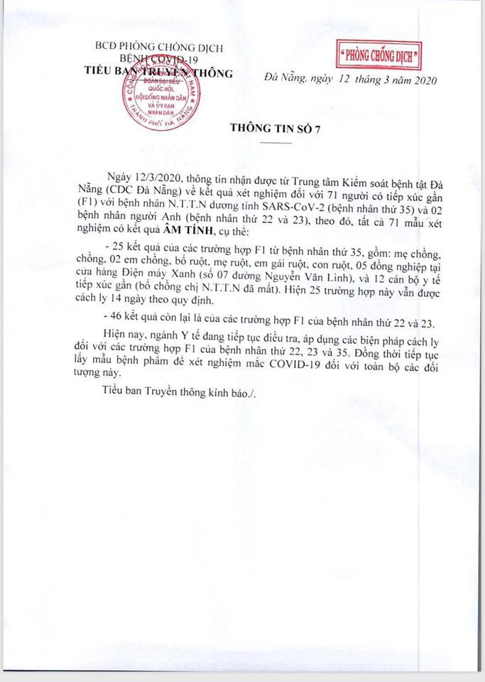 Theo đó, tất cả 71 mẫu xét nghiệm có kết quả âm tính. Cụ thể, 25 kết quả của các trường hợp F1 từ bệnh nhân thứ 35, gồm: mẹ chồng, chồng, 2 em chồng, bố ruột, mẹ ruột, em gái ruột, con ruột, 5 đồng nghiệp tại cửa hàng Điện máy Xanh (số 7 đường Nguyễn Văn Linh), và 12 cán bộ y tế tiếp xúc gần (bố chồng chị N.TN đã mất). Hiện 25 trường hợp này vẫn được cách ly 14 ngày theo quy định.
