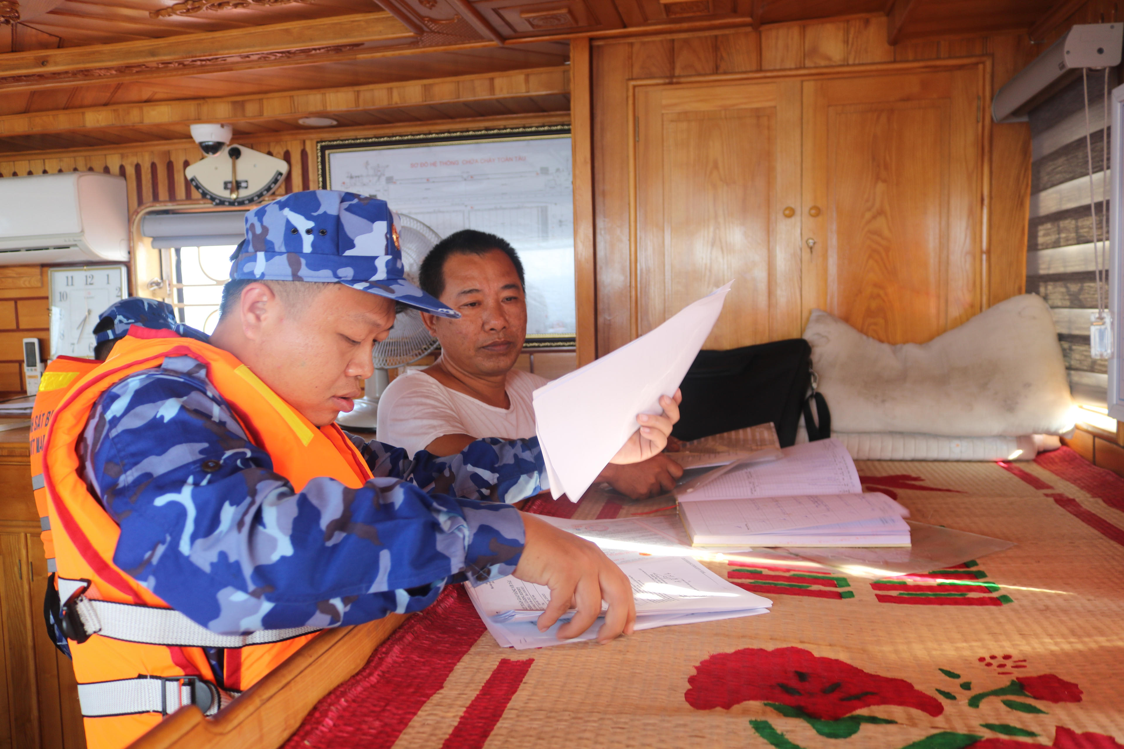 Lực lượng Cảnh sát biển đang kiểm tra một tàu hàng tại vùng biển khu vực đảo Cù Lao Xanh. |