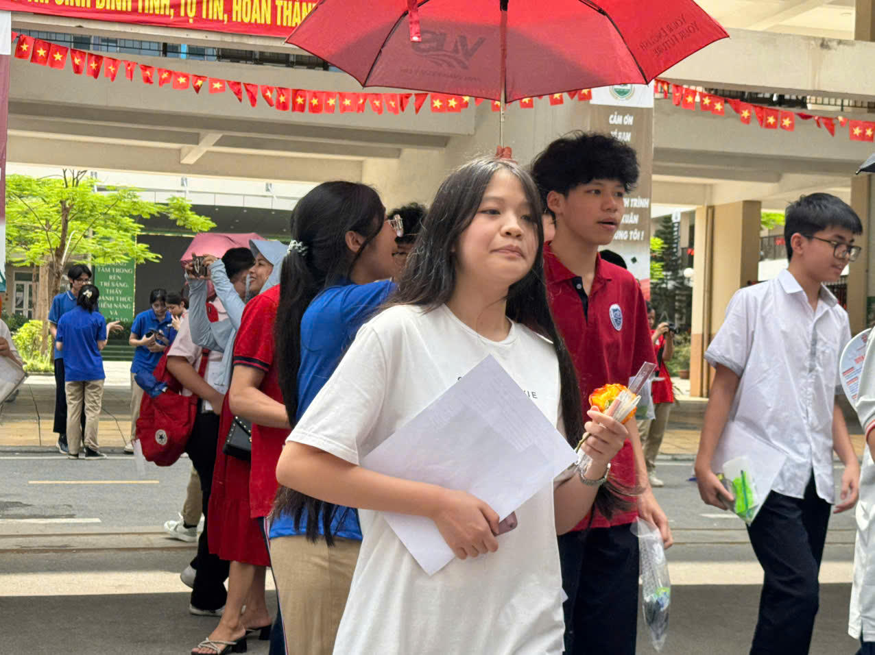Đến 10h, tiếng trống báo hiệu hết giờ làm bài thi vang lên, ở phía trước cổng trường thi, phụ huynh và tình nguyện viên đồng loạt vỗ tay. Nhiều người giơ điện thoại chụp khoảnh khắc cánh cổng trường dần mở, nhiều học sinh lần lượt bước ra với gương mặt nhẹ nhõm sau hai ngày “vượt vũ môn”.
