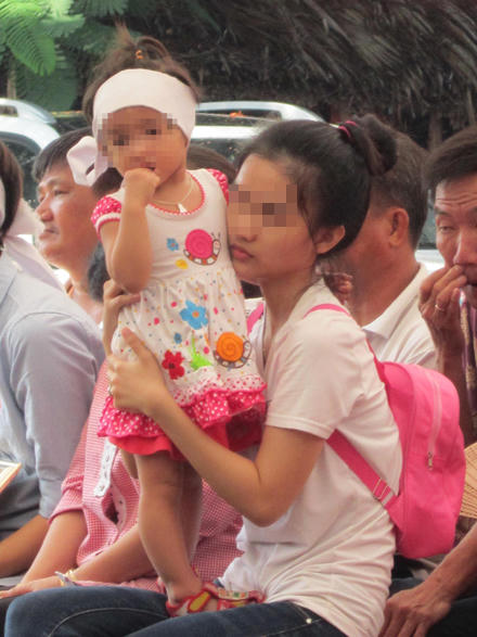 Từ rất sớm, người nhà bị hại đã ôm di ảnh, quấn khăn tang tới khu vực xử án. Họ không quên bế cháu Thúy tới để lên án hành vi của người cha. Cháu bé giờ đã hơn 2 tuổi, đầu quấn khăn tang, lâu lâu lại ngoái qua sờ lên di ảnh của mẹ rồi khóc thét, có khi sờ xong cháu lại cười.
