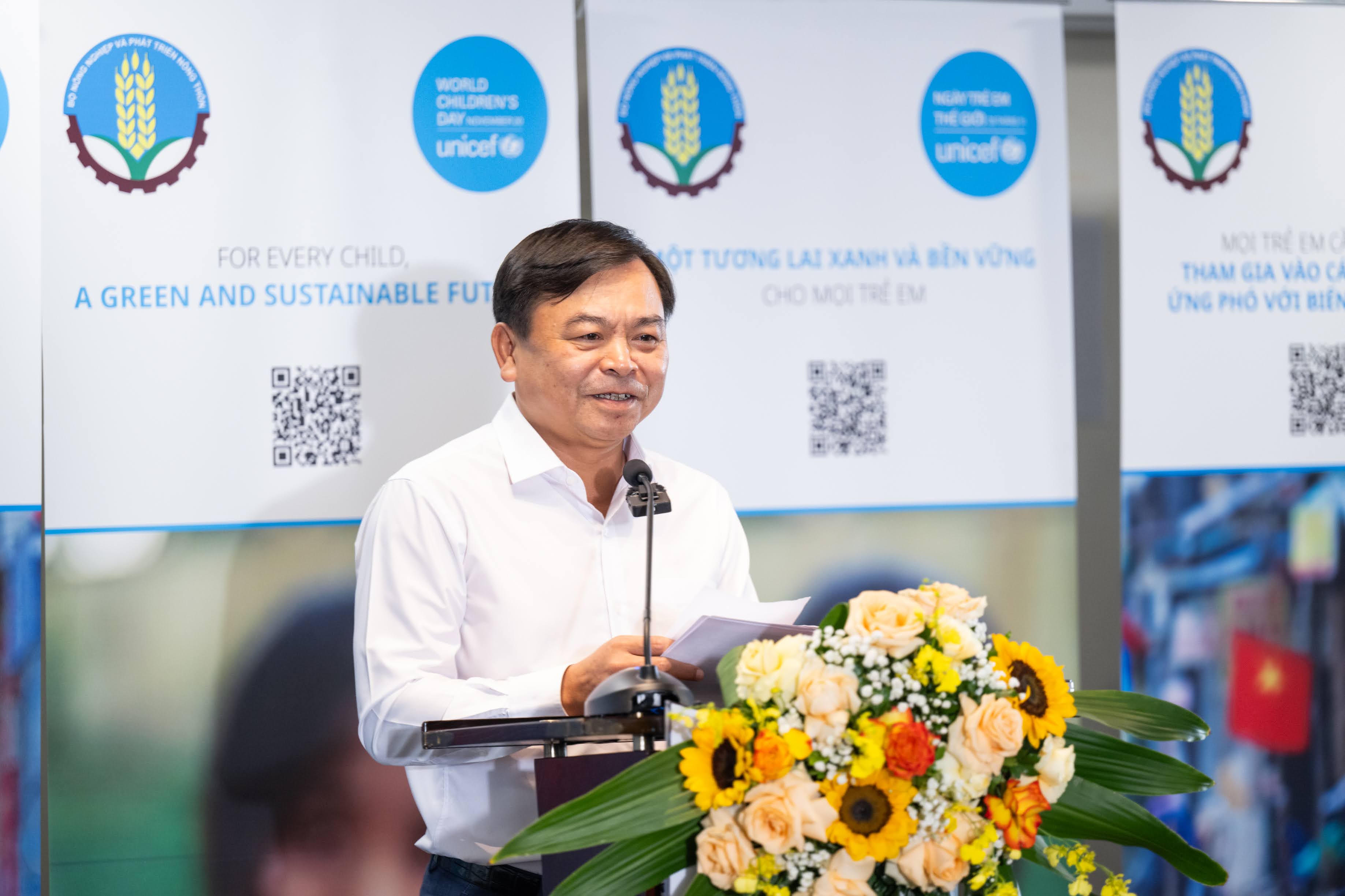 “Việt Nam đang ở một bước ngoặt quan trọng trong việc đối phó với những tác động ngày càng gia tăng của biến đổi khí hậu đối với trẻ em. Chính phủ vẫn kiên định cam kết thúc đẩy các chính sách và quan hệ đối tác nhằm bảo vệ trẻ em khỏi các rủi ro liên quan đến khí hậu, đồng thời thúc đẩy phát triển bền vững. Thông qua những nỗ lực chung, không mệt mỏi, chúng ta có khả năng biến những khó khăn như bão Yagi thành động lực để thúc đẩy phát triển. Cách tiếp cận này đảm bảo rằng mỗi trẻ em đều có thể hy vọng vào một tương lai không chỉ an toàn và khỏe mạnh, mà còn có thể phát triển hết tiềm năng của mình”, Thứ trưởng Bộ Nông nghiệp và Phát triển nông thôn Nguyễn Hoàng Hiệp phát biểu.
