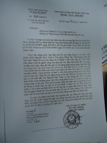 | Ủy ban Tư pháp của Quốc hội đã từng có văn bản đề nghị Chánh án TANDTC và Viện trưởng VKSNDTC xem xét lại vụ án theo quy định. |