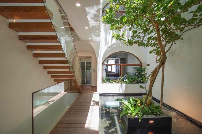 Đối với phần mái kính che giếng trời, KTS sử dụng kính cách nhiệt hạn chế tia UV có hại chiếu vào nhà nhưng vẫn tận dụng được tối đa nguồn sáng. Mái nhà này có thể tự động đóng mở do điều kiện thời tiết. Toàn bộ hệ thống tưới cây tự động giúp giảm thời gian và công sức.