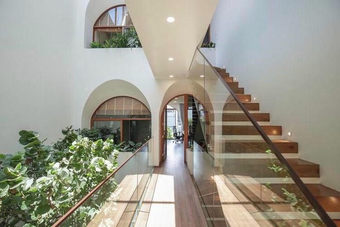 Ở tầng 2 và tầng 3, phía trước bố trí phòng ngủ lớn, phía sau bố trí phòng ngủ nhỏ hơn. Hai không gian này được nối với nhau bằng hành lang cầu. Ở giữa là giếng trời lớn xuyên suốt từ tầng 4 đến tầng trệt. Xung quanh giếng trời này, chúng tôi bố trí rất nhiều cây xanh.