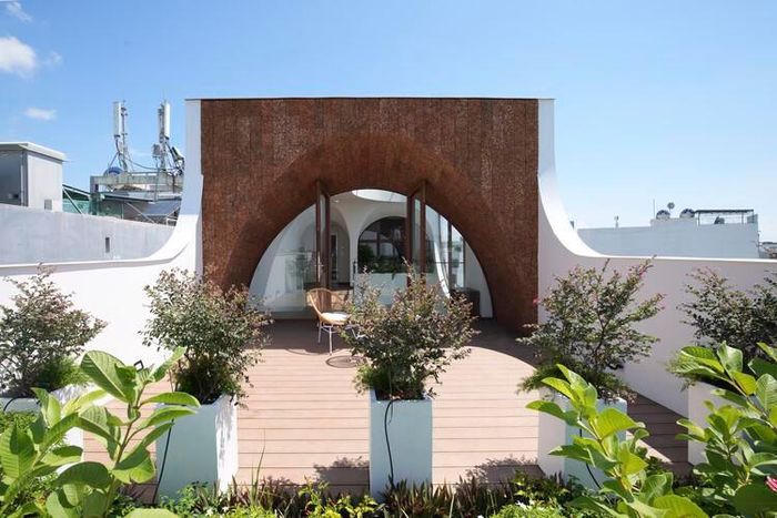 Trên tầng 4 có một vườn cây ăn trái nhỏ để thư giãn và ăn uống riêng tư của gia đình. Ở không gian này, KTS sử dụng cây xanh và sàn gỗ như một cách để chống nóng cho các tầng dưới. Do đó, tránh hiện tượng co ngót do nhiệt của bê tông cũng là một biện pháp chống thấm tốt. Trên mái nhà, tấm chống nóng XPS được sử dụng trên nền bê tông để bảo vệ và chống nóng hiệu quả.