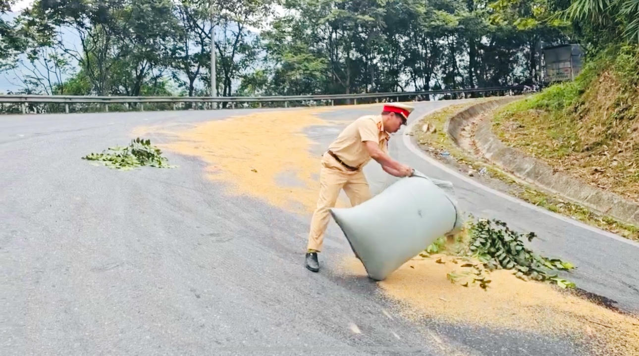 | Lực lượng Cảnh sát giao thông đã nhanh chóng triển khai thu dọn vết dầu tránh gây nguy hiểm cho người, phương tiện tham gia giao thông. |