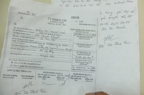 | Bản sao uỷ nhiệm chi 4 tỷ đồng được cho là có chữ ký của bà Trần Thị Thanh Phúc và đơn trình bày của khách hàng hồi tháng 11/2015. Ảnh: Thanh Lan |