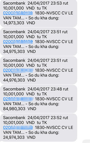 Vào khoảng khuya ngày 24/4, tin nhắn báo giao dịch rút tiền liên tục được gửi đến điện thoại anh. Tuy nhiên đến sáng 25/4, anh Tâm mới xem điện thoại và phát hiện có các tin nhắn báo đã bị rút tổng số tiền hơn 94 triệu đồng. Cứ một giao dịch thành công là trừ 10 triệu đồng. 9 giao dịch trừ hết 90 triệu đồng, giao dịch cuối cùng do số dư còn 4,9 triệu nên đối tượng xấu rút luôn số tiền này.