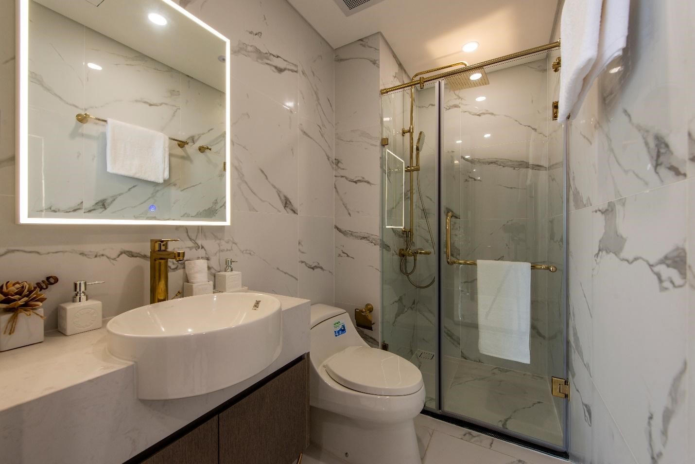 Phòng tắm tại Sunshine City Sài Gòn không thua kém bất cứ một khách sạn 5 sao nào. Toàn bộ thiết bị vệ sinh được nhập khẩu từ thương hiệu nổi tiếng châu Âu, các chi tiết mạ vàng đắt giá tạo nên chất sống vương giả