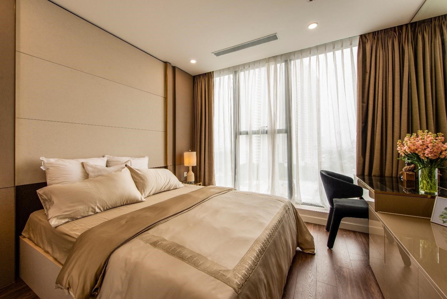 Phòng ngủ với gam màu ấm áp, tối giản, tạo cảm giác bình yên, thư thái cho chủ nhân nghỉ ngơi sau một ngày dài đầy mệt mỏi với cuộc sống. Từ căn phòng này, bạn có thể ngắm nhìn quang cảnh thành phố đầy thú vị