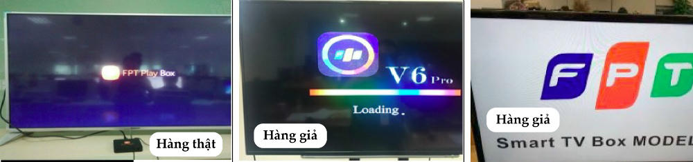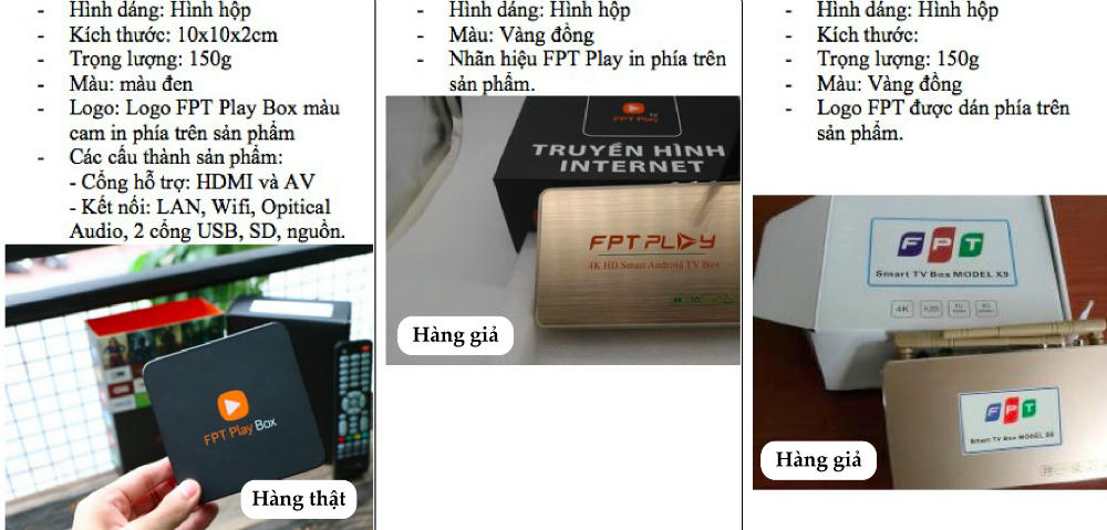 Về vỏ hộp, FPT Play Box chính hãng có logo “FPT Play Box” đặt dưới logo của các kênh truyền hình, các thông số kỹ thuật cũng được in ở mặt trước và bên hông. Ngược lại, sản phẩm giả có logo “FPT Play” (không có chữ “Box”) được đóng trong một khung vuông (hàng chính hãng không có khung này). Một đặc điểm cũng dễ nhận diện hàng giả nhãn hiệu là các sản phẩm có tên gọi “FPT Play 4K HD Smart Android TV Box” hay “FPT Smart TV Box MODEL X9”.