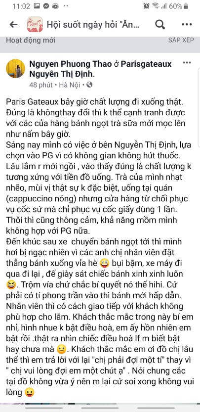 Mới đây, trên mạng xã hội xôn xao bàn tán câu chuyện của một tài khoản Facebook có tên Nguyen Phuong Thao bức xúc chia sẻ: "Paris Gateaux bây giờ chất lượng đi xuống thật. Đúng là không thay đổi thì không thể cạnh tranh được với các của hàng bánh ngọt trà sữa mới mọc lên như nấm bây giờ." - dòng trạng thái của facebook này viết.