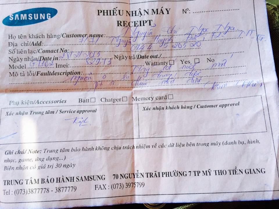 “Tôi có tham gia gói bảo hiểm 1 năm cho chiếc điện thoại trên. Ngày 28/2/2015, khi đi qua cầu khỉ, tôi bị trượt chân ngã xuống mương có nhiều vật cứng như cây cối và đá nhọn, mảnh chai. Trong lúc hốt hoảng tôi chỉ lo điện thoại bị hư sẽ mất những dữ liệu quý giá. Khi lên bờ kiểm tra lại máy thì phát hiện ra chiếc điện thoại không khởi động được, đành phải tìm đến trung tâm Bảo hiểm tại 70 Nguyễn Trãi, P1, TP Mỹ Tho, Tiền Giang. Do không khởi động được nên tôi không thể biết điện thoại bị hỏng thế nào, có thể là do lúc bị ngã xuống mương, chiếc điện thoại bị dính nuớc dẫn đến không sử dụng đựợc....” – chị Nga trình bày lại sự việc.