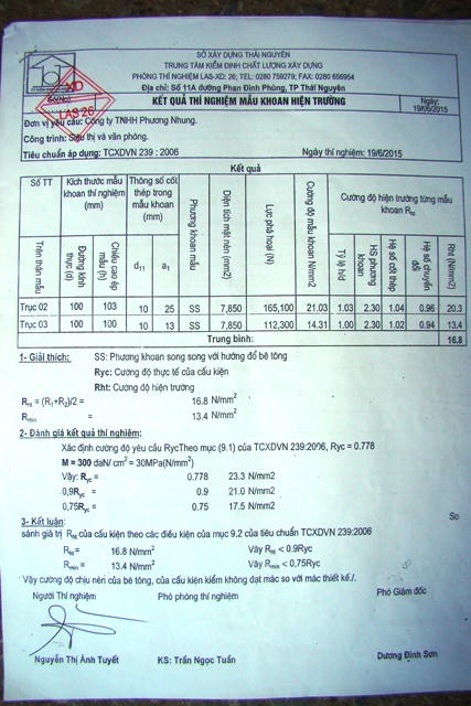 Ngày 19/06/2015 phòng thí nghiệm LAS- XD của trung tâm kiểm định chất lượng xây dựng thuộc Sở Xây dựng tỉnh Thái Nguyên đã tiến hành khoan trực tiếp lấy mẫu, liêm phong mẫu để thí nghiệm xác định cường độ yêu cầu Ryc theo mục (9.1) - TCXDVN 239: 2006 của 2 mẫu bê tông được lấy từ công trình siêu thị và văn phòng nói trên với mác thiết kế mà chủ đầu tư đưa ra là M300. Tuy nhiên, sau thí nghiệm cho thấy kết quả của cả hai mẫu thí nghiện đều không đạt yêu cầu (chỉ đạt được 168)... Với chất lượng bê tông như vậy không chỉ làm ảnh hưởng nghiêm trọng đến chất lượng của công trình mà còn tiềm ẩn những nguy cơ rủi ro cao khiến chúng ta không thể lường trước được những hậu quả nó có thể xảy ra đối với tài sản lẫn tính mạng của con người.