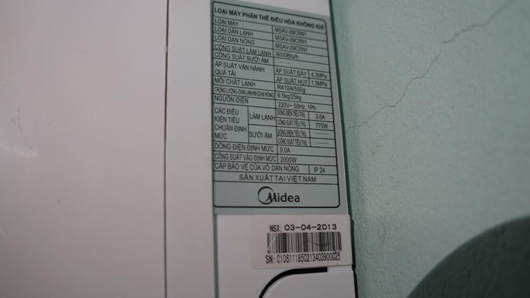 Chiều cùng ngày, anh Cường kiểm tra lại chiếc điều hòa này thì thấy băng dính dán chằng chịt một số nơi, góc cạnh của chiếc điều hòa Media nhìn khá dại. Đặc biệt, tem chiếc điều hòa này ghi ngày sản xuất là ngày 3/4/2013, tính đến giờ là đã hơn 2 năm.
