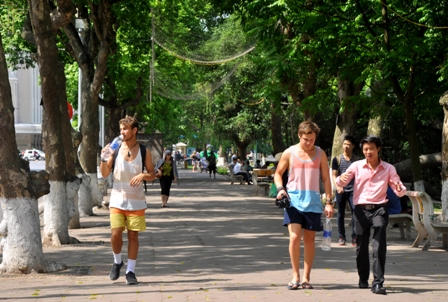 Không khó bắt gặp những hình ảnh các vị khách nước ngoài “thoải mái” đi trong nắng nóng.
