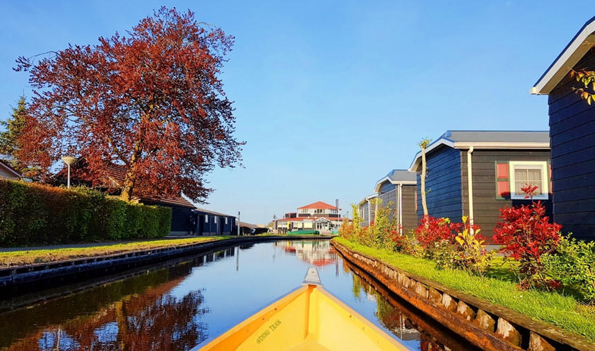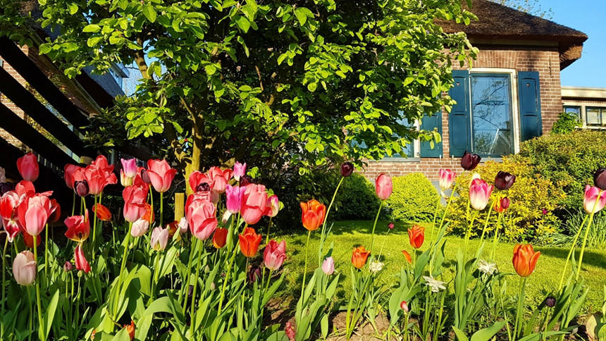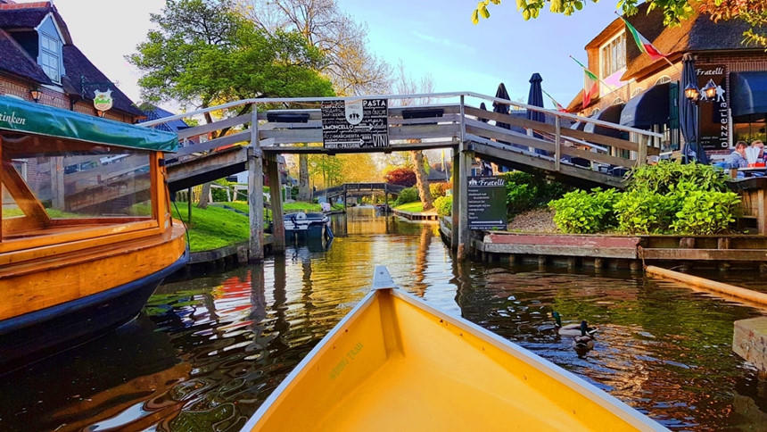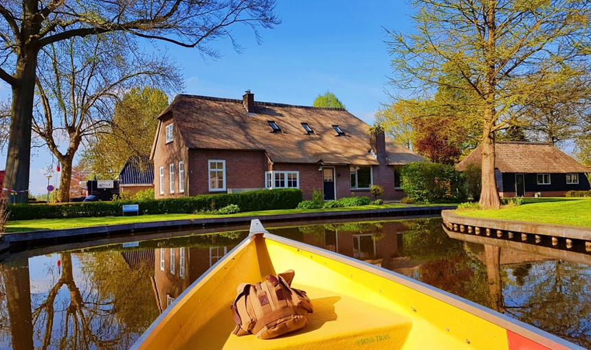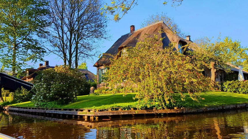Mỗi mùa, Giethoorn lại khoác một chiếc áo mới. Tôi đến Giethoorn vào những ngày đầu hè. Bầu trời trong vắt, ánh nắng chiếu xuống những tán cây rực rỡ và nụ hoa tulip cuối xuân còn sót lại…