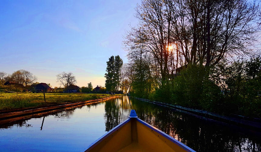 Mặt trời đổ bóng hoàng hôn mang lại cho Giethoorn nét đẹp thật lãng mạn.