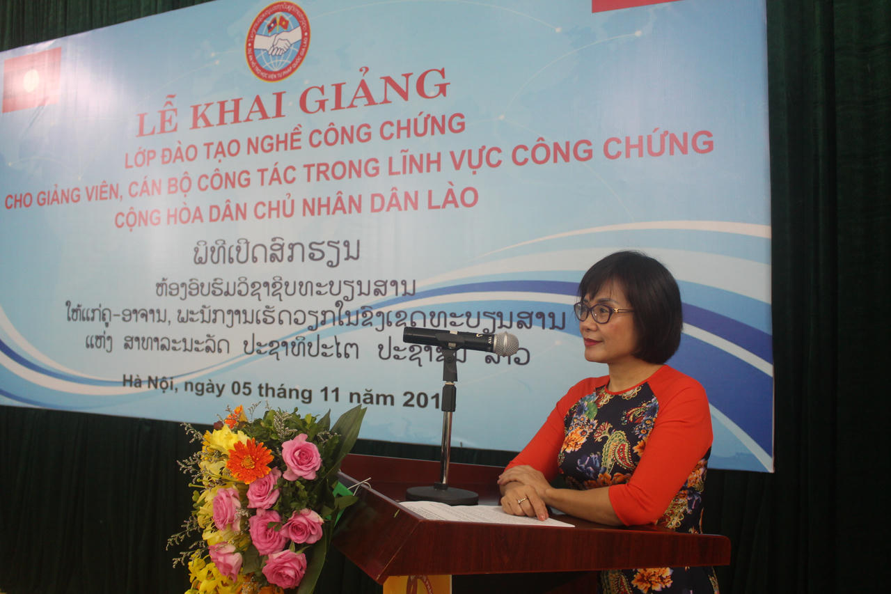 Phát biểu khai mạc buổi lễ, Thứ trưởng Đặng Hoàng Oanh nhấn mạnh đây là Lớp đào tạo thứ hai tổ chức cho cán bộ, giảng viên Lào trong khuôn khổ Dự án ODA của Chính phủ Việt Nam Hỗ trợ Học viện Tư pháp quốc gia Lào. Việc triển khai khóa đào tạo này góp phần quan trọng trong việc thực hiện mục tiêu của Dự án đồng thời cũng là cơ hội để các cán bộ, giảng viên CHDCND Lào được nghiên cứu, học tập phương pháp đào tạo nghề, cũng như kinh nghiệm thực tiễn về nghề công chứng tại Việt Nam.