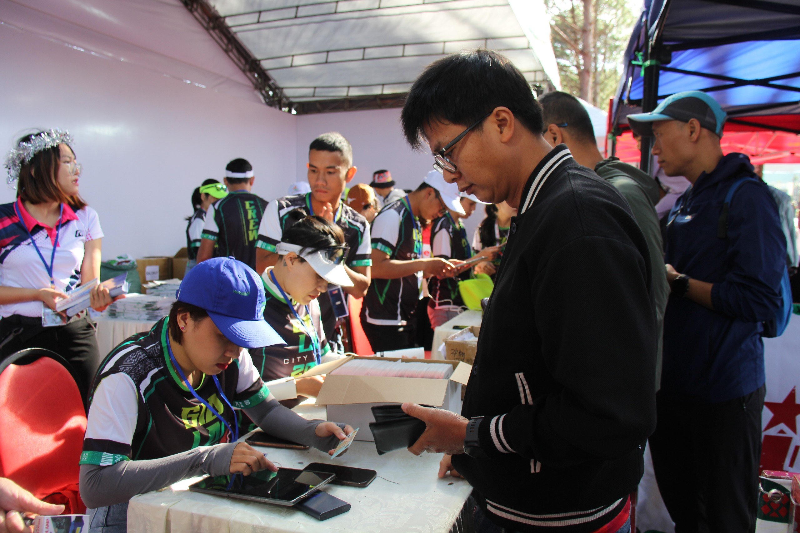 | Ban tổ chức tiến hành làm thủ tục phát race kit cho các vận động viên. |