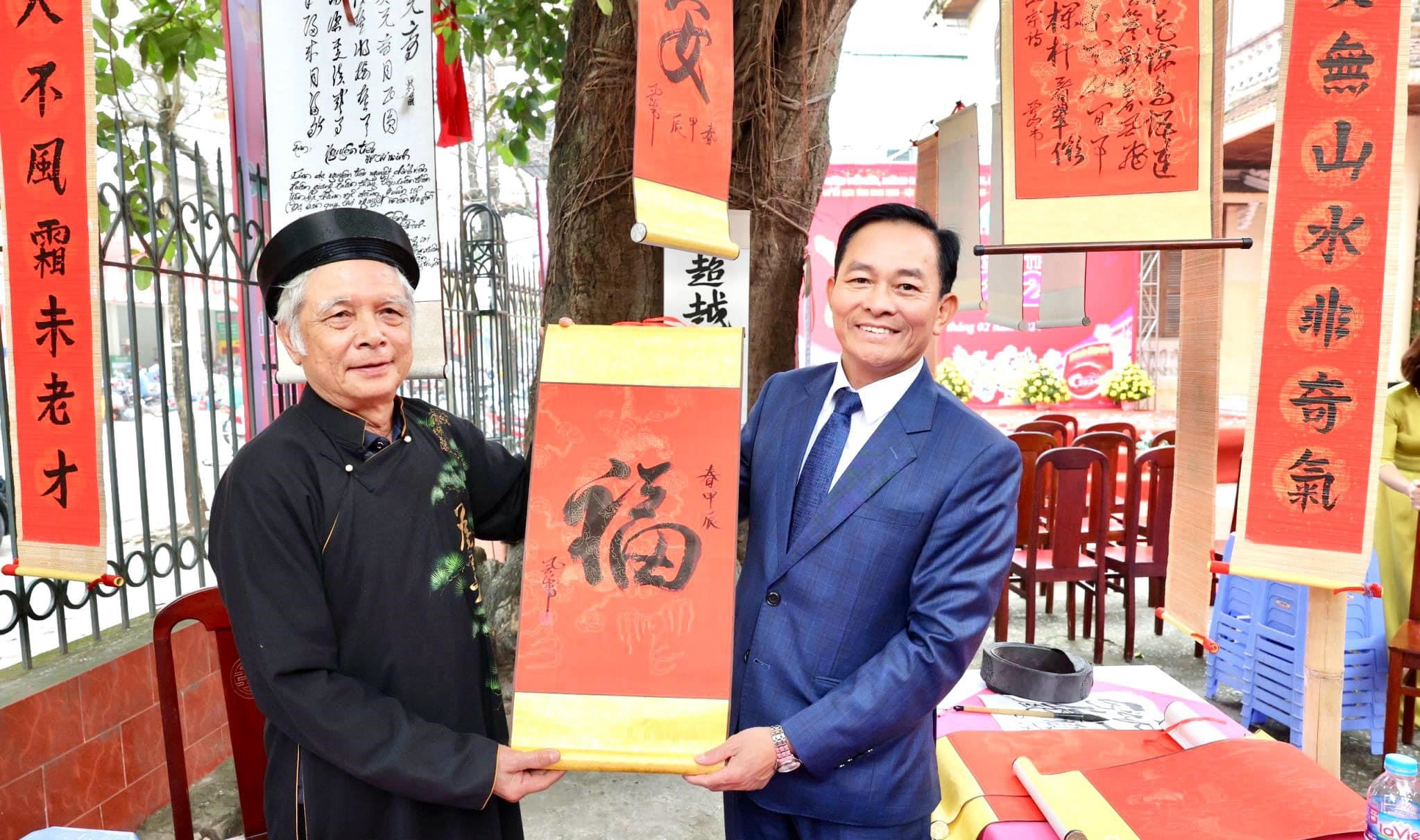 Ông Nguyễn Phùng Hoan - Phó chủ tịch HĐND tỉnh Nam Định chụp ảnh với tác giả bức tranh thư pháp |