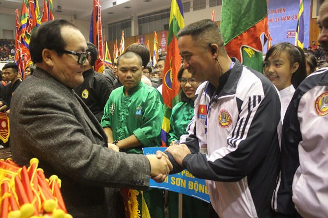 | Chủ tịch Liên đoàn Thế giới Võ cổ truyền Việt Nam Hoàng Vĩnh Giang trao cờ lưu niệm cho các đoàn tham dự. (Ảnh: Ban tổ chức cung cấp) |